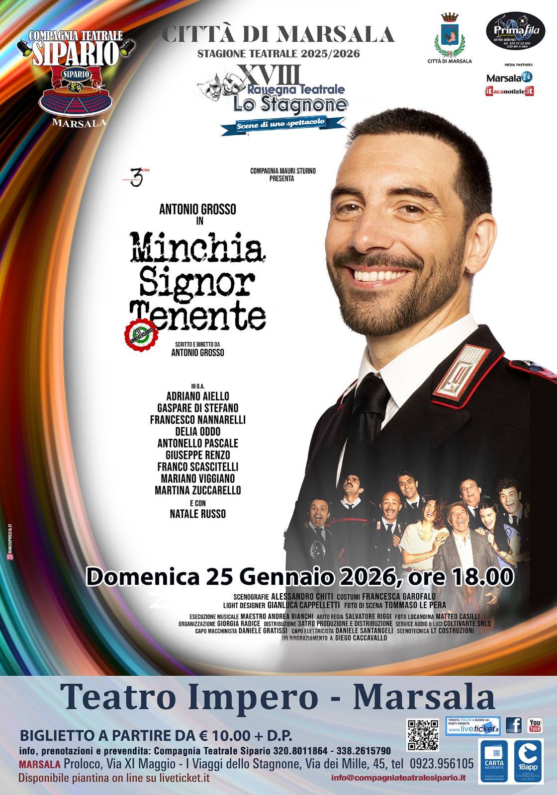 Terzo appuntamento con la 18ª rassegna teatrale “Lo Stagnone – scene di uno spettacolo”. organizzata dalla Compagnia teatrale “Sipario” diretta da Vito Scarpitta con il patrocinio del Comune di Marsala ospitata nella cornice del Teatro Impero. Domenica 25 gennaio, alle ore 18, sul palco verrà rappresentato “Minchia Signor Tenente. La memoria della strage di Capaci da 15 anni sulla scena” di Antonio Grosso per la regia di Nicola Pistoia, è uno spettacolo ambientato in una Sicilia splendida e contraddittoria. “Minchia Signor Tenente” racconta la quotidianità di una piccola stazione dei Carabinieri, dove la routine lenta e spesso divertente viene improvvisamente sconvolta da un evento cruciale. L’espressione amara del titolo, mormorata “tra i denti” per non sfidare l’autorità, diventa simbolo della frustrazione di uomini semplici ma coraggiosi, che combattono ogni giorno il male senza clamori. Lo spettacolo affronta il tema della legalità con tono tragicomico, mostrando Carabinieri anonimi, pieni di umanità, tra momenti seri, passioni e piccoli drammi quotidiani.