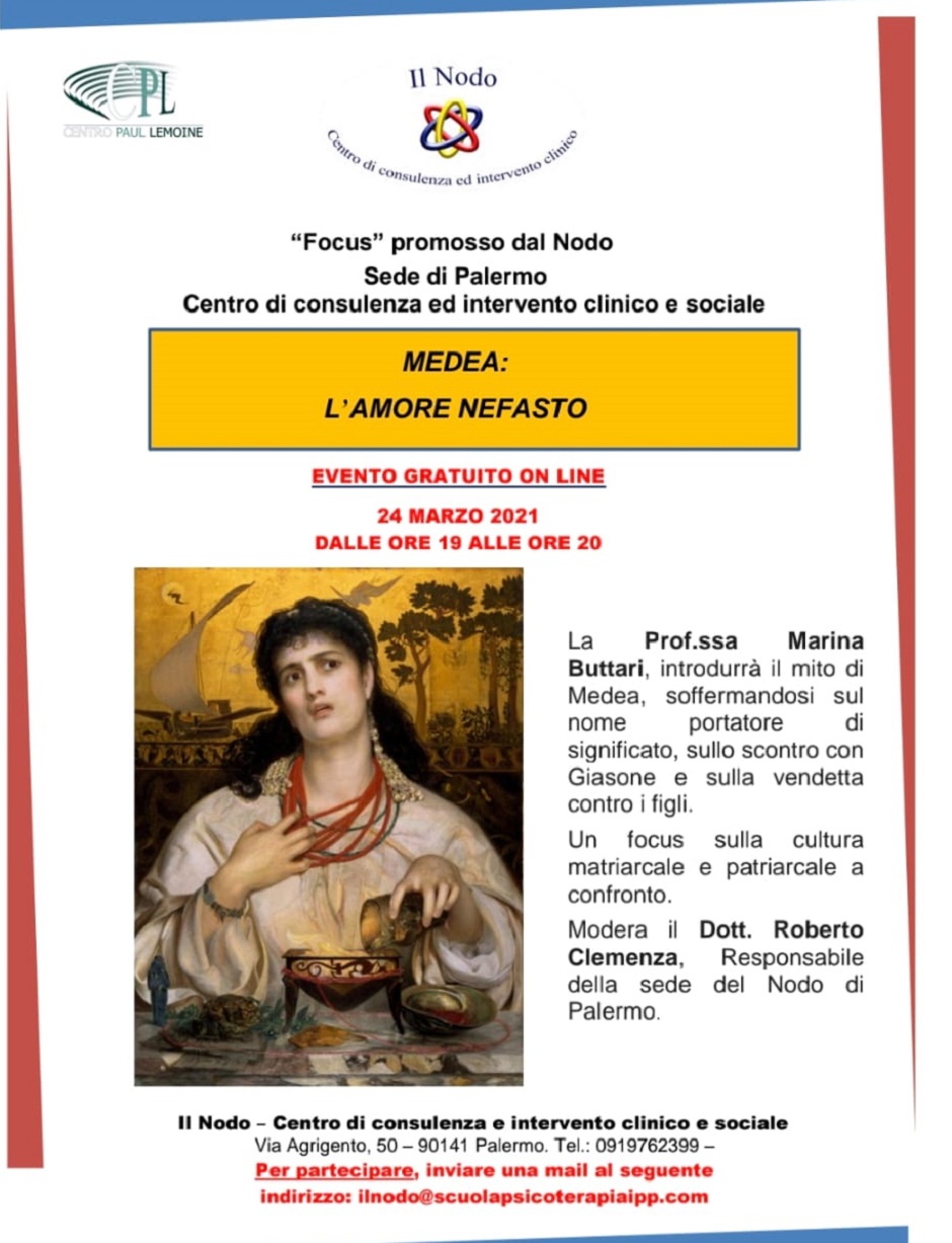 Nonostante il Covid19, la cultura non si ferma. Ieri si è tenuta la conferenza online “Medea: l’Amore Nefasto” presieduta dalla Professoressa Marina Buttari, la quale ha introdotto il mito e ne ha analizzato le radici e le peculiarità, focalizzandosi inoltre sul confronto tra la cultura matriarcale e patriarcale. Ha moderato il Dottore Roberto Clemenza, Responsabile della sede del Nodo di Palermo, centro di consulenza ed intervento clinico e sociale; presente anche il direttore del Nodo, Monica Mandalà.
