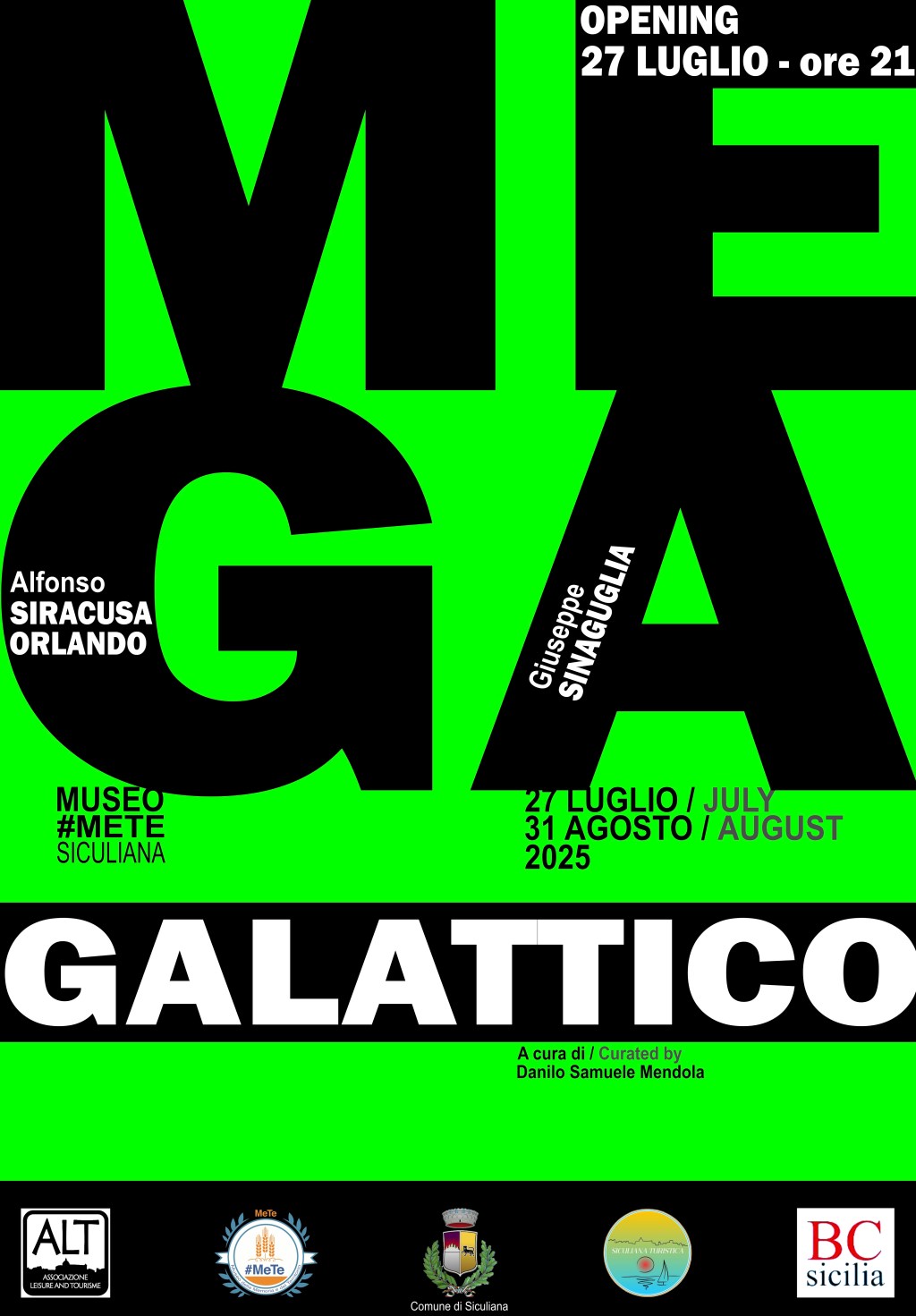 L’arte contemporanea, come il cielo, è uno spazio che ci osserva dall’alto e ci restituisce immagini inattese di noi stessi. La mostra Megagalattico, bi-personale di Alfonso Siracusa Orlando e Giuseppe Sinaguglia, trasforma il Museo #MeTe di Siculiana in un osservatorio dell’alterità, in un luogo in cui il confine tra umano e alieno, tra il locale e il cosmico, tra la serietà e il gioco viene costantemente attraversato e messo in discussione.