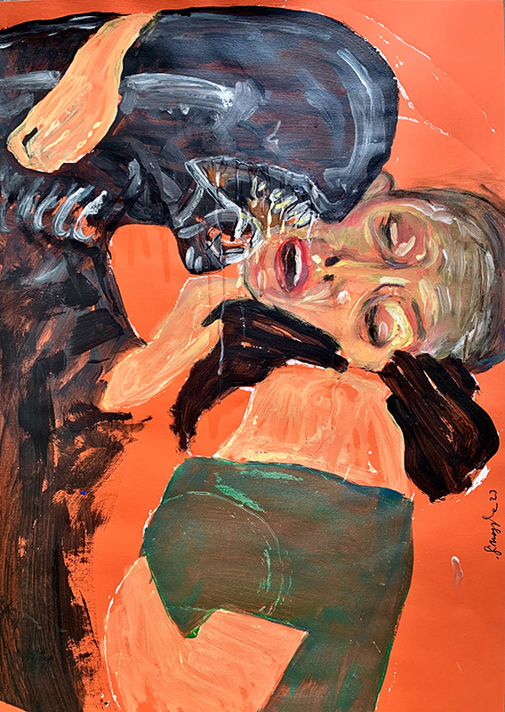 Attraverso l’iconografia pop della fantascienza cinematografica e televisiva, l’artista mette in scena celebri creature aliene in un gesto universale e archetipico: il bacio. Un gesto semplice, ma carico di significati emotivi e simbolici, qui trasposto in contesti surreali che superano i confini biologici, culturali e planetari.