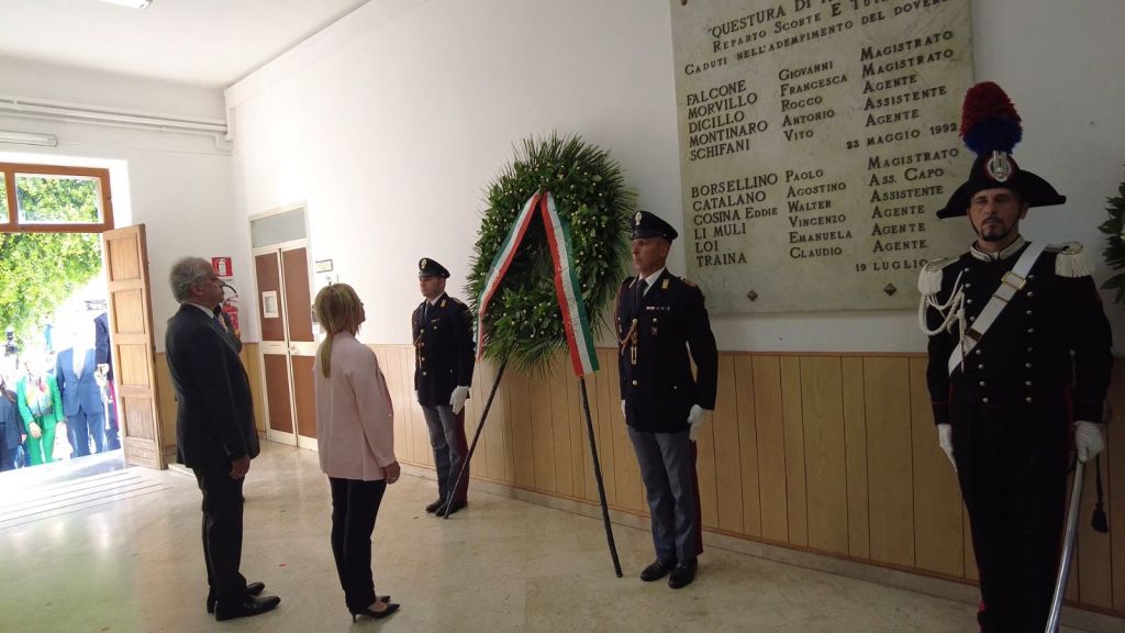 La Presidente del Consiglio è arrivata di buon’ora a Palermo. Il volo di Stato è atterrato un quarto d’ora prima delle 9 all’aeroporto Falcone Borsellino. La Presidente ha deposto una corona di fiori davanti alla lapide che ricorda tutte le vittime che si trova all’interno della Caserma Lungaro della Polizia di Stato. in un primo tempo dovevano essere presenti i giornalisti come ogni anno ma all’ultimo istante, ieri sera, la Questura ha chiuso le porte informando che non sarebbero stati ammessi.
