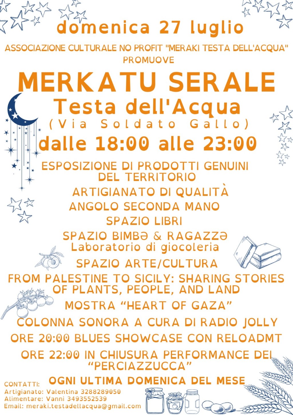 L’associazione culturale no profit Meraki Testa Dell’Acqua è lieta di annunciare la quarta edizione del MERKATU, che si terrà domenica 22 luglio presso la Contrada Testa dell’Acqua (Noto).