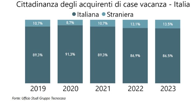 Su questo segmento di mercato è stata molto significativa la componente di acquirenti stranieri, da sempre attratti dalle bellezze del paese, che nel 2023 è stata pari al 13,5% (nel 2019 erano il 10,7%). Alla fine del 2023 e inizi del 2024 si sono fatti sentire gli effetti del conflitto bellico e del freno dell’economia tedesca. I cittadini tedeschi, da sempre amanti delle nostre località, hanno messo in campo una maggiore prudenza che li ha portati a procrastinare l’acquisto dell’immobile a tempi più sereni oppure a ridurre il capitale da investire, con la conseguenza che si è visto un forte ridimensionamento di acquisti da parte di tedeschi sul lago di Garda dove da sempre si riversavano. Al contrario si segnalano acquisti nelle località turistiche meno costose (esempio Iseo).