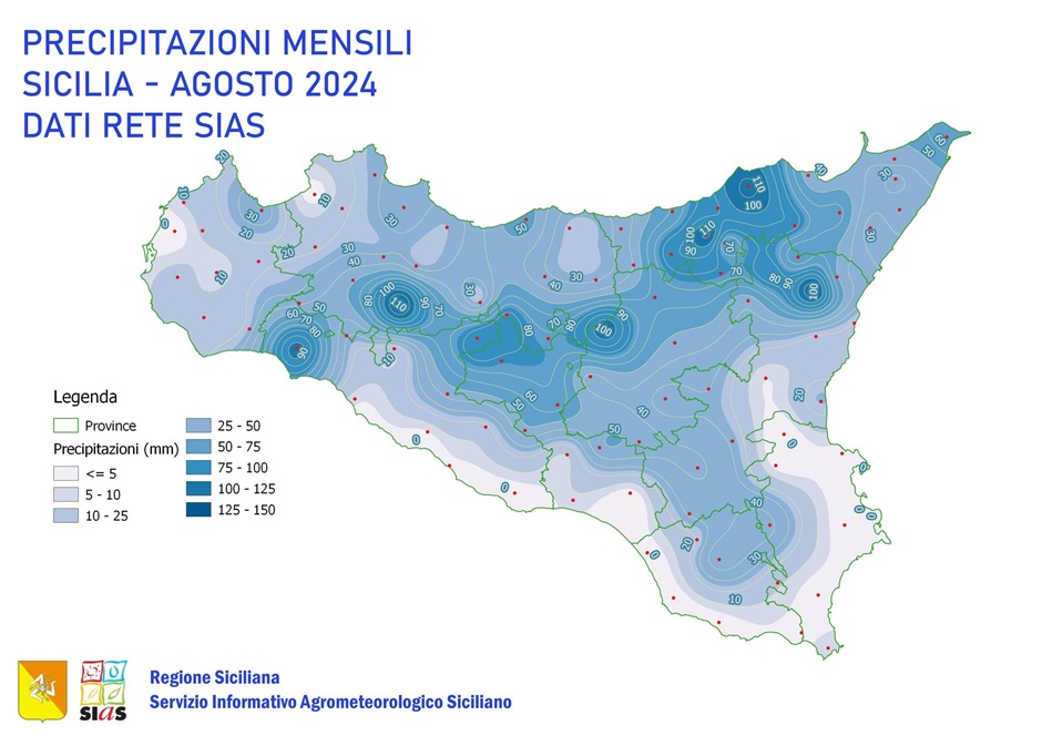 “Il numero più elevato di giorni piovosi sulla rete Sias, pari a 12, è stato registrato dalla stazione Linguaglossa Etna Nord, mentre sono numerose le stazioni, ubicate per lo più sulla fascia meridionale dell’Isola, dove non è stato registrato durante il mese alcun evento piovoso. La media regionale della precipitazione totale in base ai dati Sias risulta pari a 37 mm, abbondantemente superiore alla norma di 12 mm per il periodo 2003-2022 – aggiungono dal Sias -Non si tratta di un valore eccezionale, tenendo conto che basta andare al 2022 per incontrare valori superiori; l’agosto più piovoso per la Sicilia resta quello del 2018, quando media regionale fu di 92 mm e durante il mese solo 2 giorni non fecero registrare piogge. Il massimo accumulo mensile per la rete SIAS di 119 mm è stato registrato dalla stazione Prizzi (Palermo).