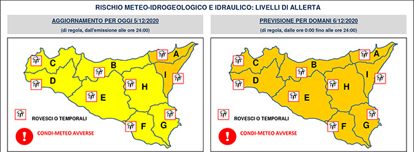 La Protezione civile regionale ha diffuso un avviso di allerta meteo ARANCIONE per condizioni meteo avverse su tutta la Sicilia, valido fino alle ore 24 di domani, domenica 6 dicembre.