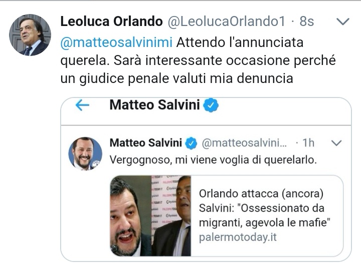 Ieri lo aveva accusato di una ossessione “patologica” per i migranti che agevola le mafie e per questo Matteo Salvini oggi ha scritto su Twitter di avere voglia di querelare Leoluca Orlando.