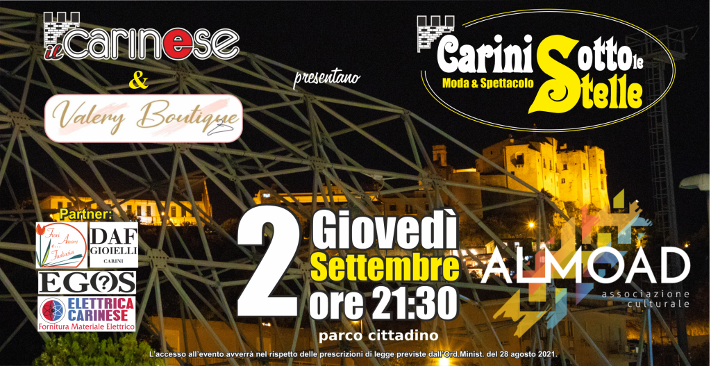 Durante “Carini sotto le Stelle” moda e spettacolo si alterneranno a momenti che valorizzeranno l’impegno sociale, in un contesto “urban” che porterà sul palco anche diversi talenti carinesi. In quella che si prospetta come una splendida serata dominata dall’imponente Castello Baronale, l’accesso all’evento sarà regolato in ottemperanza all’ordinanza ministeriale in materia di contenimento della diffusione del Covid 19. Presentano la manifestazione, Roberto Di Bona e Antonella Giotti”.