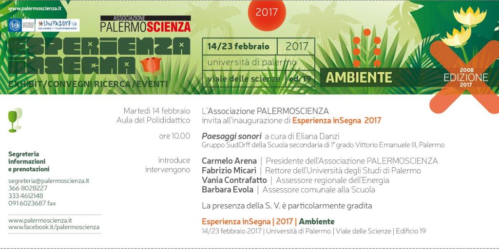 È il programma di Esperienza InSegna 2017, da domani al 23 febbraio a Palermo, il grande Festival della scienza che quest’anno compie dieci anni, diventato ormai una delle più importanti realtà di divulgazione scientifica nel Sud Italia. L’iniziativa è ideata e organizzata dall’associazione Palermoscienza, che ha coinvolto l’Università, il Cnr, l’Invg, l’Inaf e l’Osservatorio Astronomico, la Soprintendenza del mare, la Guardia costiera e oltre 500 animatori tra studenti e docenti.
