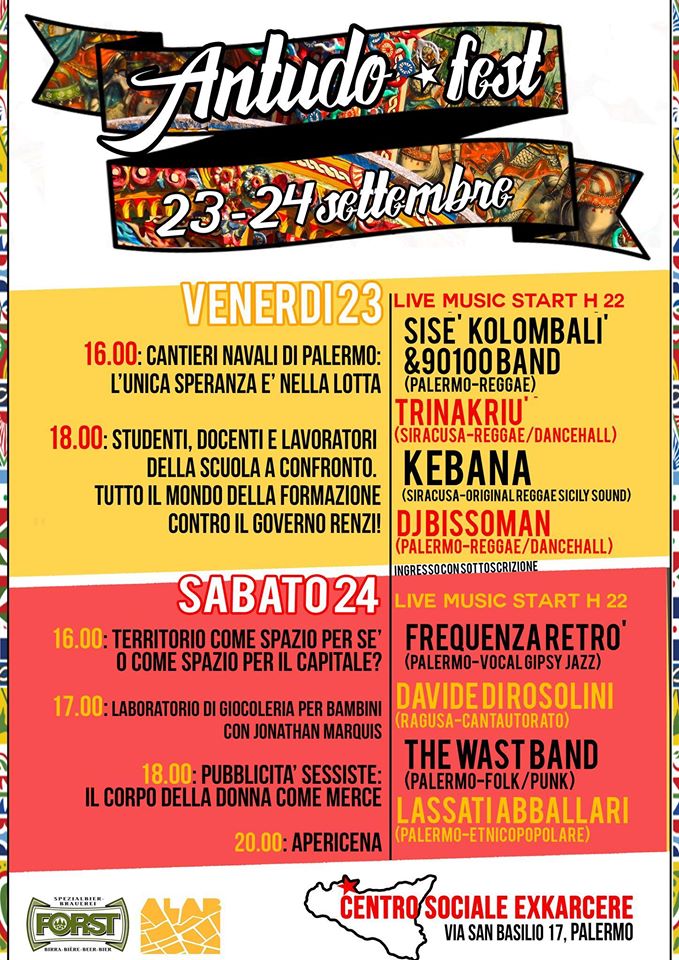 Antudo Fest a Palermo. Al Centro sociale Ex Karcere, che si trova in via S.Basilio 17, si terrà nei giorni 23 e 24 settembre l’Antudo Fest. Due giorni di concerti, dibattiti, esposizioni di artigianato, laboratori di giocoleria per bambini e varie altre forme di intrattenimento che vedranno quali artefici e protagonisti musicisti, artisti, artigiani del territorio siculo con l’intento di offrire alla città un piacevole momento di socialità e informazione dando possibilità di espressione alle tante risorse e soggettività creative che caratterizzano e arricchiscono la nostra terra.
