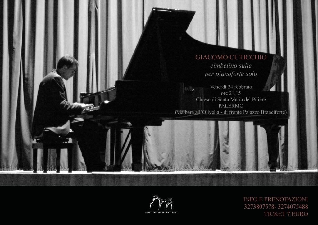 Venerdì 24 febbraio alle ore 21.15, presso la Chiesa di S. Maria del Piliere (Piazzetta degli Angelini, 1) promossa dall’Associazione Amici dei Musei Siciliani, si ospiterà in anteprima il Cimbelino – Suite per pianoforte solo di Giacomo Cuticchio.