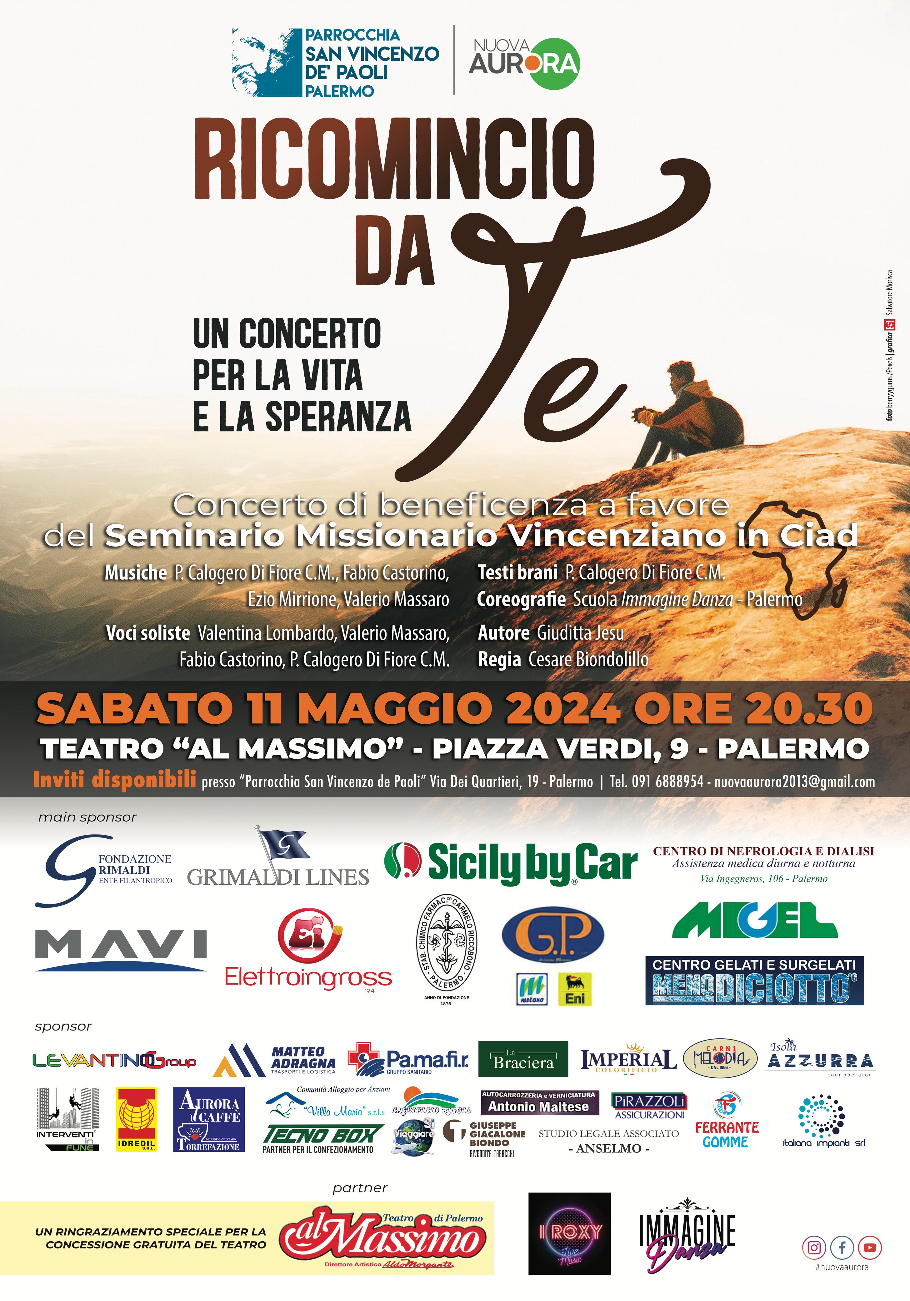 “Ricomincio da te”, un’opera musicale per la solidarietà al teatro “Al massimo” di Palermo il prossimo 11 maggio 2024. Padre Calogero Di Fiore, parroco della parrocchia san Vincenzo de Paoli, porta in scena un’opera musicale inedita per sostenere una missione in Ciad. L’evento, che coinvolge circa 100 volontari tra coro, cantanti, musicisti e tecnici, ha un scopo benefico: i proventi saranno devoluti all’acquisto di un mezzo di trasporto per una missione in Africa, dove i missionari vincenziani assistono le popolazioni più povere. Una parte dei fondi sarà inoltre destinata alla formazione dei sacerdoti della diocesi di Palermo.