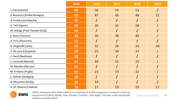 Nei sette mesi che ci separano d quel rilevamento le schede del sondaggio Swg fanno notare una crescita di un punto percentuale nel gradimento e la scalata di un posto, da ultimo a penultimo. Questo anche per effetto del crollo del governatore della Calabria, Oliviero, che perde 7 punti percentuali dopo averne persi due nel corso dell’anno precedente.