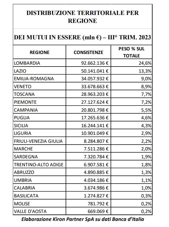 Con riferimento all’andamento dello stock mutui dal primo trimestre dal 2019 e la distribuzione per regione delle consistenze registrate nel terzo trimestre 2023, la Sicilia è al nono posto con 16.244.141 euro (4,3%).