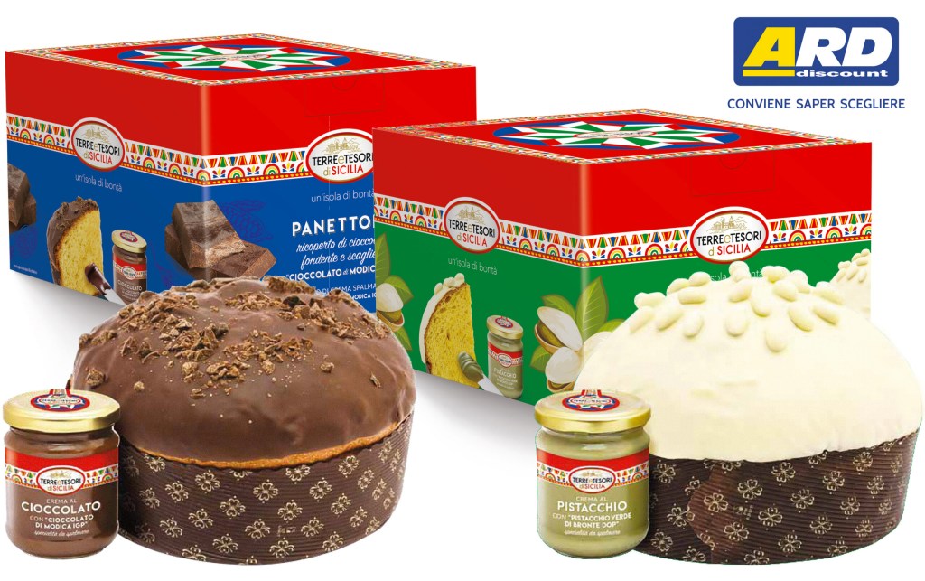Un Natale al gusto siciliano del cioccolato di Modica IGP e del pistacchio di Bronte DOP. Ard Discount firma il piacere delle feste con due nuovi prodotti della linea “Terre e Tesori di Sicilia”: si tratta del panettone ricoperto di cioccolato fondente e scaglie di cioccolato di Modica IGP accompagnato da un vaso di crema spalmabile al “Cioccolato di Modica IGP” e del panettone ricoperto di cioccolato bianco e pistacchi accompagnato da un vaso di crema spalmabile al pistacchio con “Pistacchio verde di Bronte DOP”.