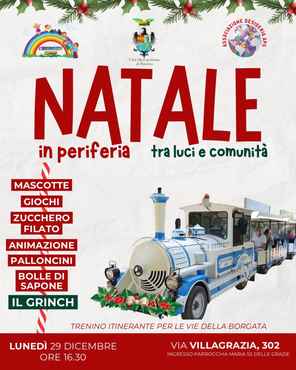 L’iniziativa è promossa dall’Associazione Desideria APS e rientra nel calendario di attività natalizie ideate per rafforzare il senso di comunità, favorire l’incontro tra i residenti e restituire centralità ai luoghi della periferia attraverso momenti di festa e partecipazione condivisa. Il progetto è finanziato dalla Città Metropolitana di Palermo, a sostegno di interventi culturali e sociali rivolti al territorio.