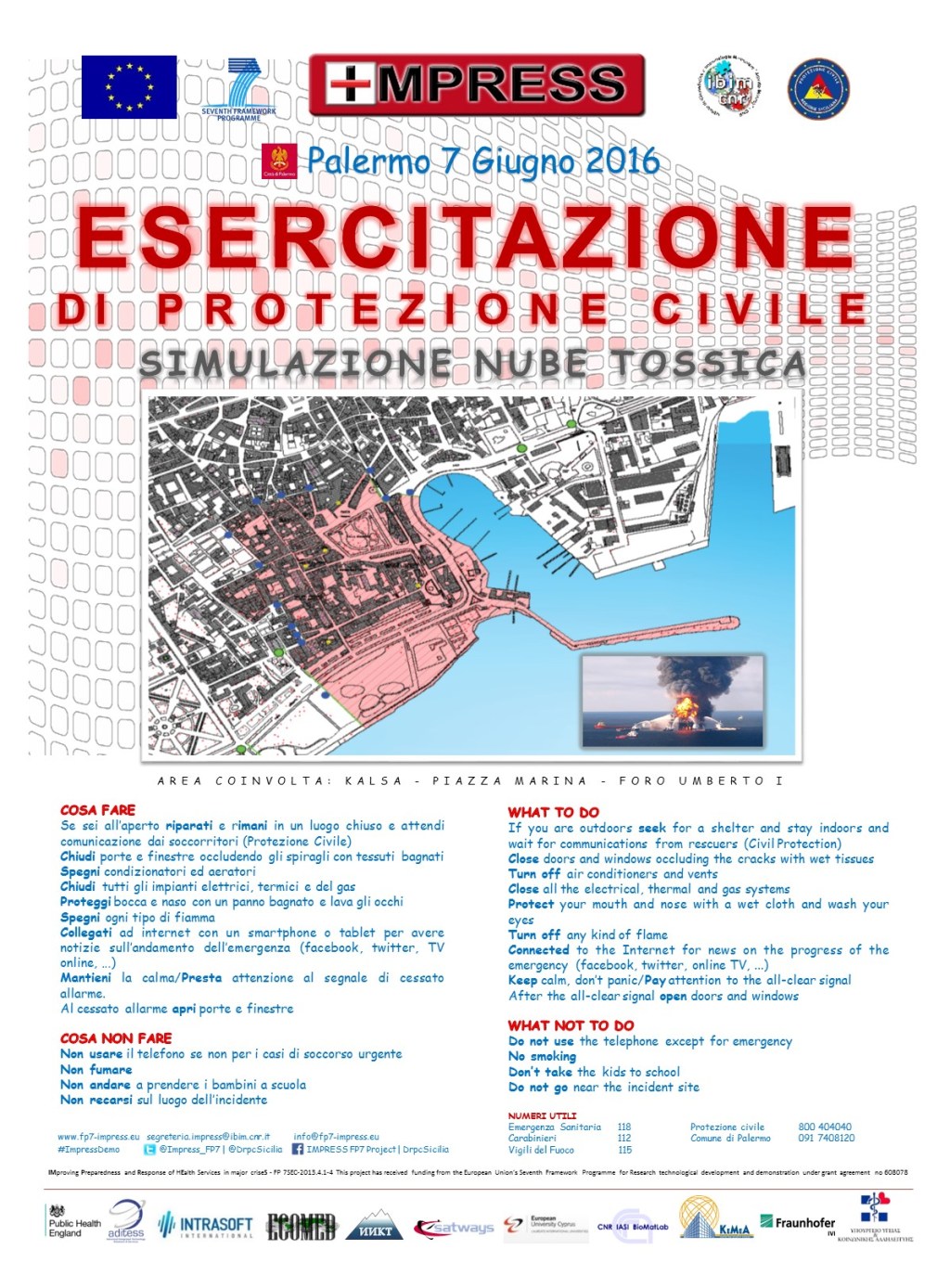 Si procederà alla messa in sicurezza della popolazione presente nell’Istituto Nautico “Gioeni Trabia”, sede del Rettorato di Palermo, nella sede del Tribunale Amministrativo Regionale di Palermo, nel museo di Palazzo Abatellis e negli uffici comunali presenti nell’area con l’ausilio di personale del Comune, Polizia municipale e Organizzazioni di Volontariato. Saranno allestiti nei pressi di piazza Marina e al Foro Umberto. I due PMA, due tende di assistenza (supporto piscologico, informazione e formazione sui metodi comportamentali rischio NBC), due tende di decontaminazione (NBCR), una unità di comando DRPC e un’area accoglienza gestita dal 12° Battaglione dell’Arma dei Carabinieri. Presso l’Ospedale “Buccheri La Ferla” verrà testato il piano di emergenza ospedaliera in caso di maxiemergenza sanitaria (PEIMAF).