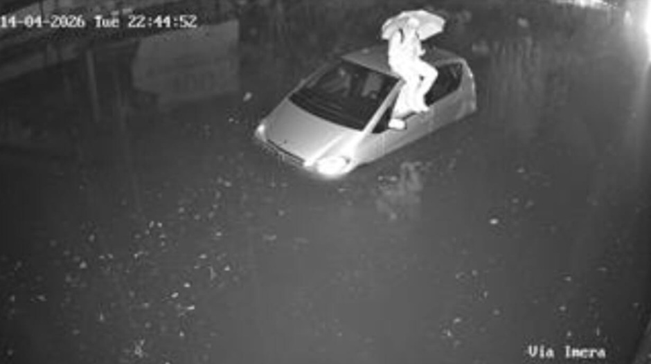 Uno degli episodi più eclatanti della nottata si è verificato in via Imera, dove il livello dell’acqua ha raggiunto rapidamente il mezzo metro d’altezza, rendendo la carreggiata del tutto impraticabile. Intorno alle 22.45, il conducente di una Mercedes Classe A è rimasto intrappolato dalla piena senza alcuna possibilità di proseguire la marcia. In un misto di rassegnazione e prontezza, l’uomo è stato costretto a uscire dal finestrino dell’abitacolo per rifugiarsi sul tettuccio della vettura. È rimasto lì, seduto sotto la pioggia battente con un ombrello aperto, in un’attesa surreale che la situazione migliorasse o che arrivassero i soccorsi.