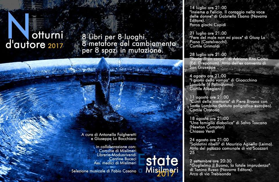 Gli appuntamenti letterari dell’edizione 2017 di Notturni d’autore sono iniziati con Gabriella Ebano, proseguiti con Giusy La Piana, Adriana Corso, Gioacchino Lo Nobile, Piera Bivona, Salvo Toscano e Maurizio Agnello. La rassegna Notturni d’Autore è realizzata in collaborazione con il Comune di Misilmeri, la libreria indipendente di Palermo Modusvivendi, la Cantina Buceci – che offre una degustazione dei suoi vini – e l’Associazione Medici di Misilmeri, che donerà alle biblioteche scolastiche del paese una copia di ogni libro presentato.