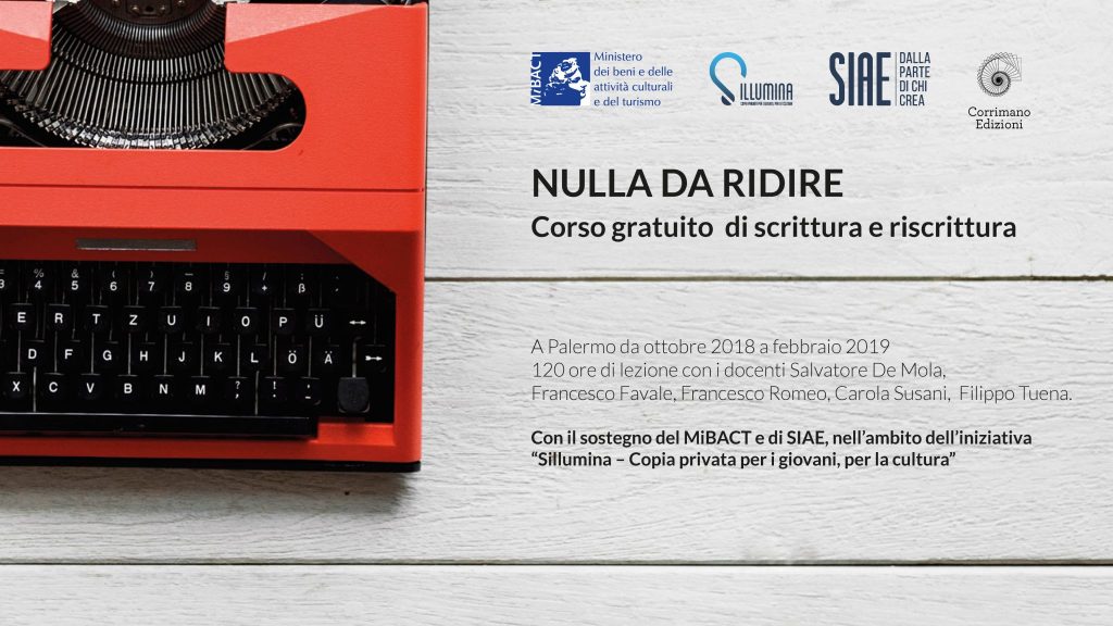 Con il sostegno del MiBACT e di SIAE, nell’ambito dell’iniziativa “Sillumina – Copia privata per i giovani, per la cultura”, Corrimano Edizioni propone il corso gratuito di scrittura e riscrittura: per partecipare a “Nulla da ridire” c’è tempo fino al 17 settembre. Per i partecipanti non residenti nella città di Palermo, il progetto copre anche i costi di viaggio e soggiorno.