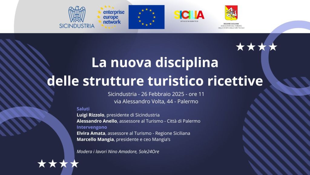 Mercoledì 26 febbraio, alle ore 11, la sede di Sicindustria a Palermo (via Alessandro Volta, 44) ospiterà un incontro dedicato alla nuova normativa sulle strutture turistico-ricettive.