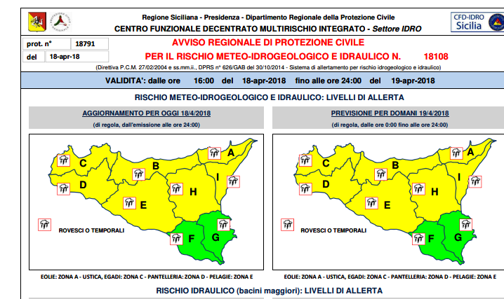 Un nuovo allerta meteo valido dalle 16 di oggi (mercoledì 18 aprile) fino alle 24 di domani (giovedì 19 aprile) è stato diramato dalla Protezione civile e reso noto dal Comune di Palermo.