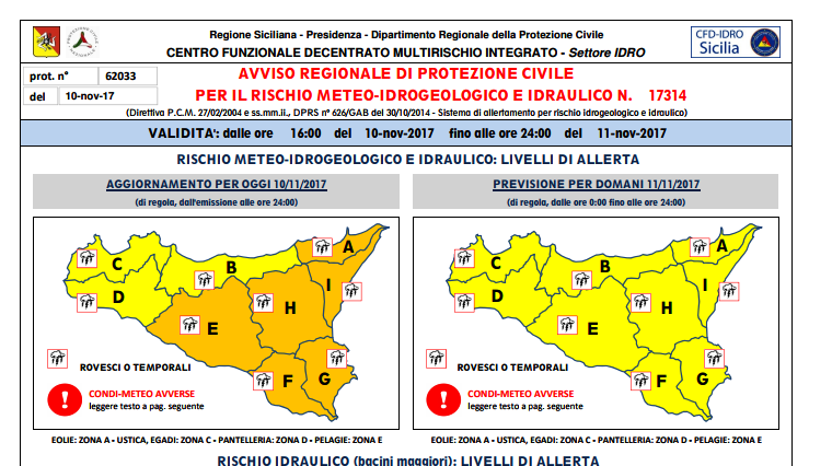 La Protezione civile regionale ha diffuso un’allerta meteo gialla per il rischio meteo-idrogeologico ed idraulico segnalando con particolare rilievo le potenziali condizioni meteo avverse fino alle ore 24 di domani, 11 novembre.