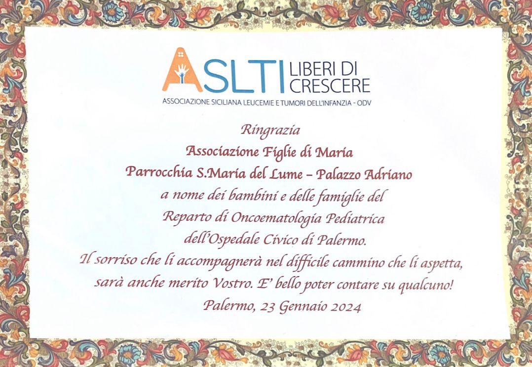 Al termine delle festività, una rappresentanza dell’associazione Figlie di Maria della parrocchia Santa Maria del Lume di Palazzo Adriano, si è recata presso l’ospedale palermitano per dare testimonianza diretta della donazione del ricavato ottenuto tramite il mercatino natalizio pari a 1.850 euro. L’associazione Aslti- Liberi di Crescere, i bimbi e le famiglie ringraziano per la solidarietà e la collaborazione mostrata.