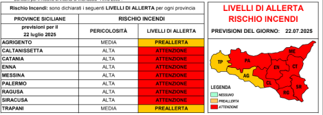 Rischio incendi da bollino rosso in sette province su nove e medio solo ad Agrigento e Trapani.
