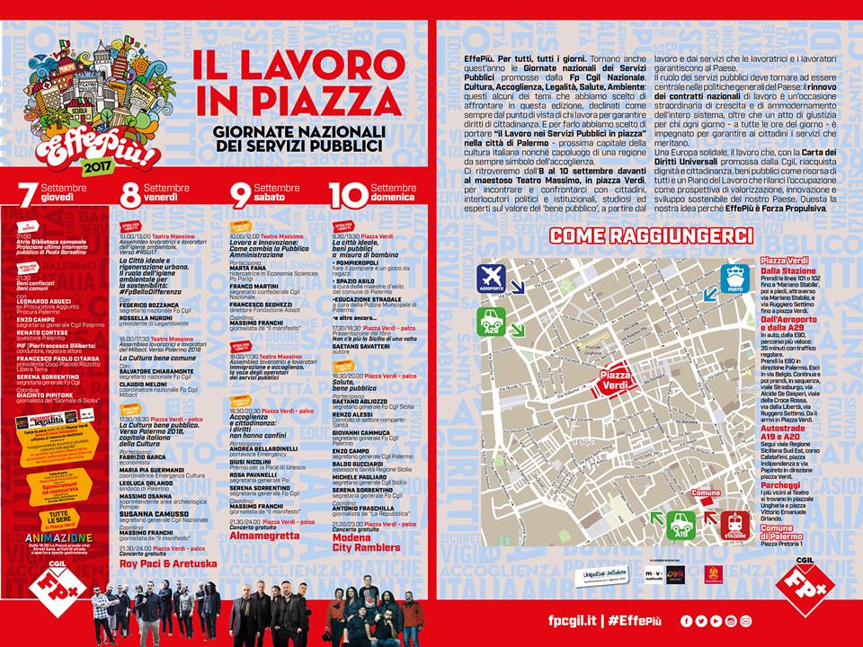 Il valore insostituibile dei servizi pubblici, a partire da chi li garantisce per tutti, tutti i giorni. Questo l’obiettivo delle Giornate nazionali dei Servizi Pubblici, dal titolo ‘#EffePiù, il Lavoro in Piazza’, promosse dalla Fp Cgil Nazionale, la categoria che rappresenta i lavoratori pubblici della Cgil, e che si terranno a Palermo a partire da domani giovedì 7 settembre e fino a domenica 10 settembre. Una lunga quattro giorni che si terrà in piazza Verdi, dentro e fuori il Teatro Massimo, fatta di iniziative e dibattiti, ma anche di intrattenimento, musica e gastronomia, per mostrare il valore dei beni pubblici e per incontrare e confrontarsi con cittadini, interlocutori politici e istituzionali, studiosi ed esperti, sul valore del ‘bene pubblico’, a partire dal lavoro e dai servizi che le lavoratrici e i lavoratori garantiscono al Paese.