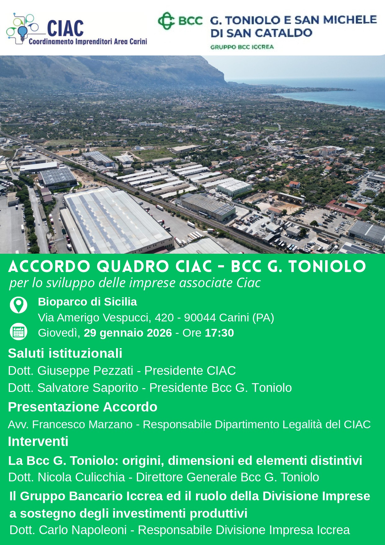Sostenere gli investimenti produttivi  e lo sviluppo delle imprese dell’area industriale di Carini. C’è un accordo tra la CIAC – Coordinamento Imprenditori Area Carini, un’associazione che ha il fine di riunire alcune aziende che operano nella zona carinese e di farsi portavoce con le istituzioni delle problematiche presenti nel territorio per cercare di risolverle – e la BCC G Toniolo, ossia una delle banche facenti parte al Gruppo Bancario BCC Iccrea.