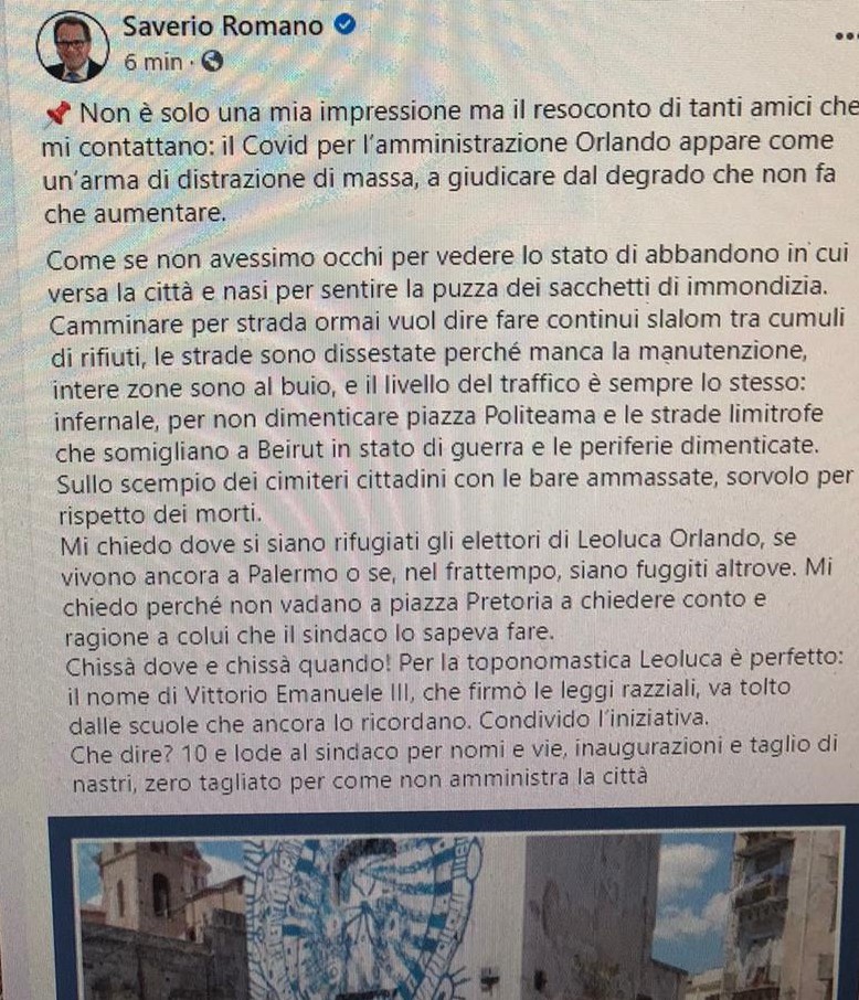 Romano usa i social per dire la sua con un post che non lascia spazio a interpretazioni ” Come se non avessimo occhi per vedere lo stato di abbandono in cui versa la città e nasi per sentire la puzza dei sacchetti di immondizia. Camminare per strada ormai vuol dire fare continui slalom tra cumuli di rifiuti, le strade sono dissestate perché manca la manutenzione, intere zone sono al buio, e il livello del traffico è sempre lo stesso: infernale, per non dimenticare piazza Politeama e strade limitrofe”.