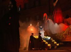 Cade il velo della peste e santa Rosalia si mostra in tutto il suo splendore barocco. La statua della santa d'oro portata da un carro a forma di giglio adesso combatte la peste con una rosa in mano