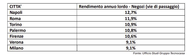 “Chi acquista un negozio – prosegue Megliola – sappiamo però che realizza l’operazione solo se i rendimenti annui lordi arrivano almeno al 9%, ma sempre più spesso si chiedono rendimenti più elevati, soprattutto all’aumentare del rischio vacancy (percentuale di immobili non occupati /locati tra quelli offerti in vendita/locazione). Soltanto chi investe nelle zone top chiede rendimenti più contenuti. Oltre al posizionamento dell’immobile, si guarda anche alla “solidità” dell’attività che sarà svolta all’interno dell’immobile. I rendimenti più elevati si registrano a Napoli dove, a detta della nostra rete sono in forte aumento gli acquisti per investimento”.