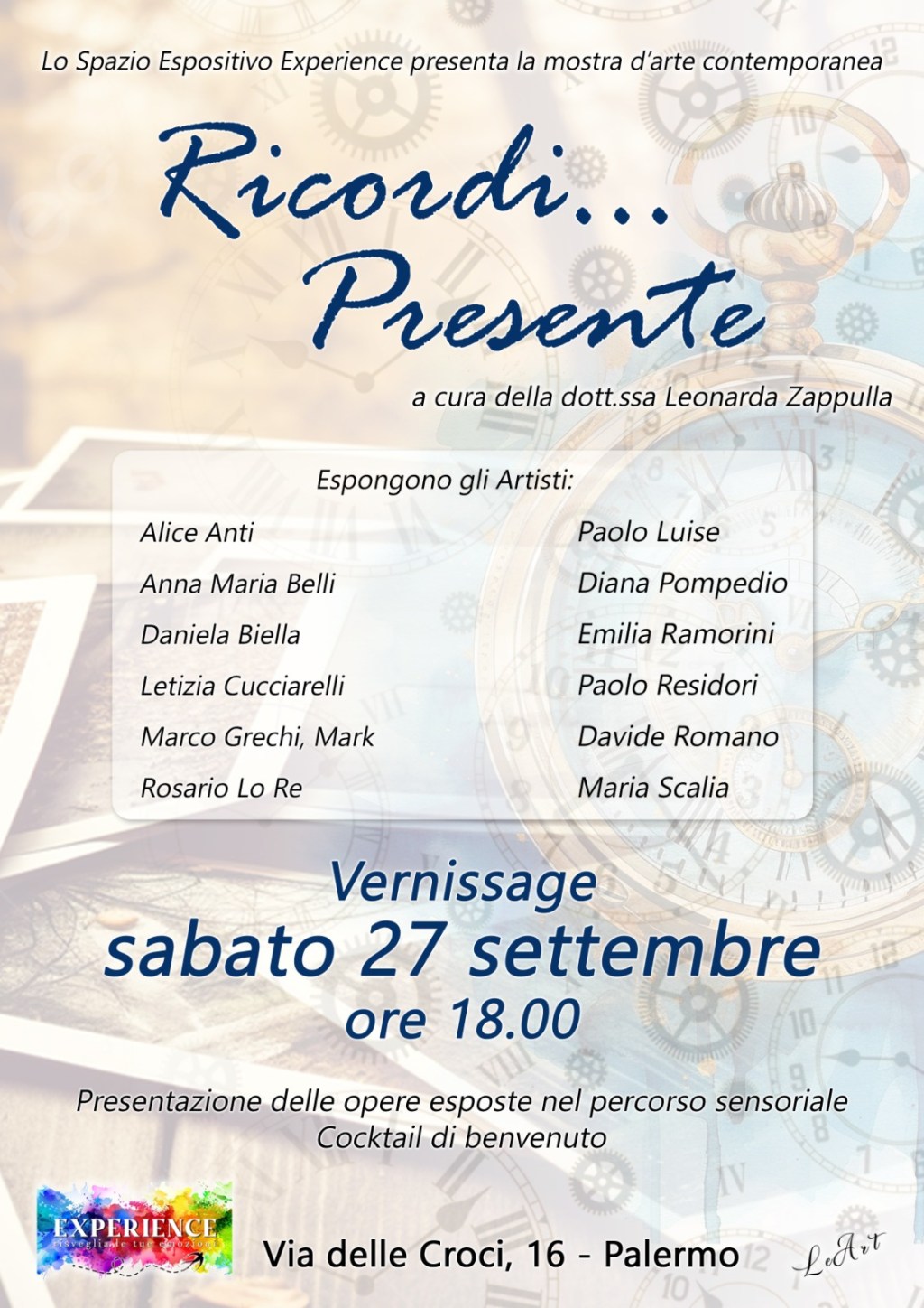 “Ricordi…Presente” è il titolo della collettiva che è stata inaugurata allo spazio espositivo “Experience” alle 18:00 di sabato 27 settembre in via delle Croci 16 a Palermo. “Si tratta di un progetto – spiega la curatrice Leonarda Zappulla, storico e critico dell’arte – che invita a riflettere sull’intreccio profondo tra memoria e vita quotidiana”.
