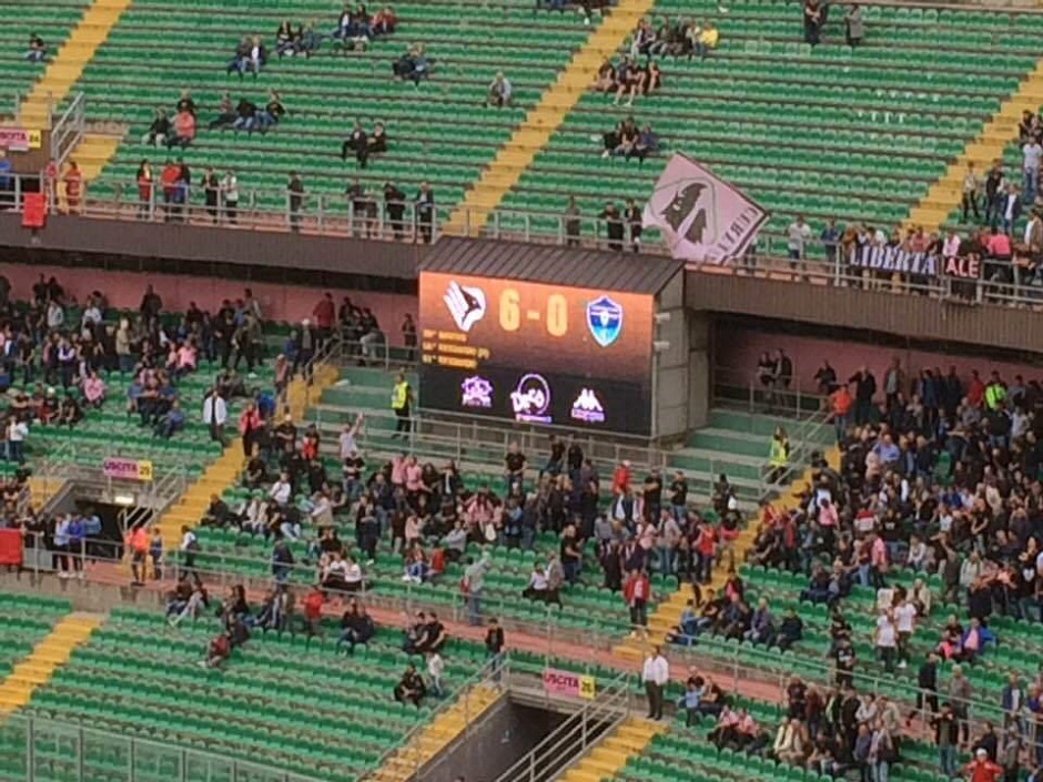 Prende applausi anche il portiere Pelagotti che poco prima della mezzora vola alla sua sinistra su un tiro di Catalano destinato a finire all’incrocio dei pali. Netto il divario fra le due squadre con il Palermo che alla mezzora trova anche la quinta rete con un colpo di testa di Martinelli su cross dalla sinistra di Vaccaro. Pergolizzi prova a tenere alta la concentrazione della sua squadra avvicendando qualcuno dei suoi titolari: spazio a Sforzini per Ricciardo, Mauri per Martinelli e Lucera per Ficarrotta.