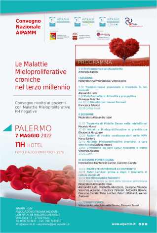 “ll convegno ‘Le malattie mieloproliferative nel Terzo millennio’ intende approfondire alcuni di questi aspetti “affrontare il tema della cura nella sua globalità, informando i pazienti nello stesso tempo sui trattamenti in uso e allo studio, sulle nuove conoscenze relative a questo campo di ricerca che si è molto intensificato negli ultimi anni”, aggiunge Vincenzo Accurso, ematologo (Policlinico Giaccone, Palermo) e coordinatore Sicilia di Aipamm OdV.