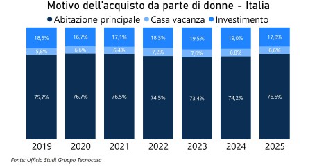 Tra le motivazioni che spingono all’acquisto prevale l’abitazione principale (76,5%), mentre gli acquisti per investimento si attestano al 17%, quota in calo rispetto al 2024 quando era al 19%. È un trend in linea con il ribasso della percentuale di acquisto per investimento rilevato in generale a livello nazionale. Del 17% delle donne che ha acquistato nel 2025 per investimento, il 29,2% ha un’età compresa tra 45 e 54 anni, a seguire con il 24,2% le donne con un’età compresa tra 55 e 64 anni. Si investe quindi una volta raggiunta una certa stabilità lavorativa.