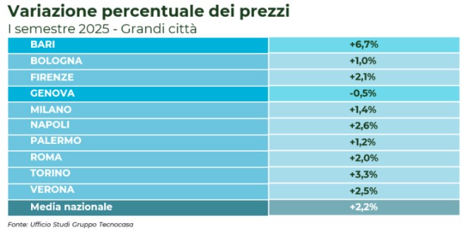 Secondo le nuove rilevazioni dell’Ufficio Studi Gruppo Tecnocasa, le grandi città chiudono con un aumento dei prezzi del 2,2%. Palermo fa segnare un aumento del 1,2% mentre Bari mette a segno il risultato migliore (+6,7%). Milano registra un +1,4%, la Capitale chiude con +2,0%; unica eccezione Genova che registra un calo dei valori dello 0,5%. I capoluoghi di provinciasegnano un aumento dei prezzi del 2%, l’hinterland delle grandi città del +1,9%. Tra le province delle metropoli si segnala l’aumento dei prezzi più spiccato delle province di Bari (+4,3%), di Firenze (+2,8%) e di Milano (+2,5%).