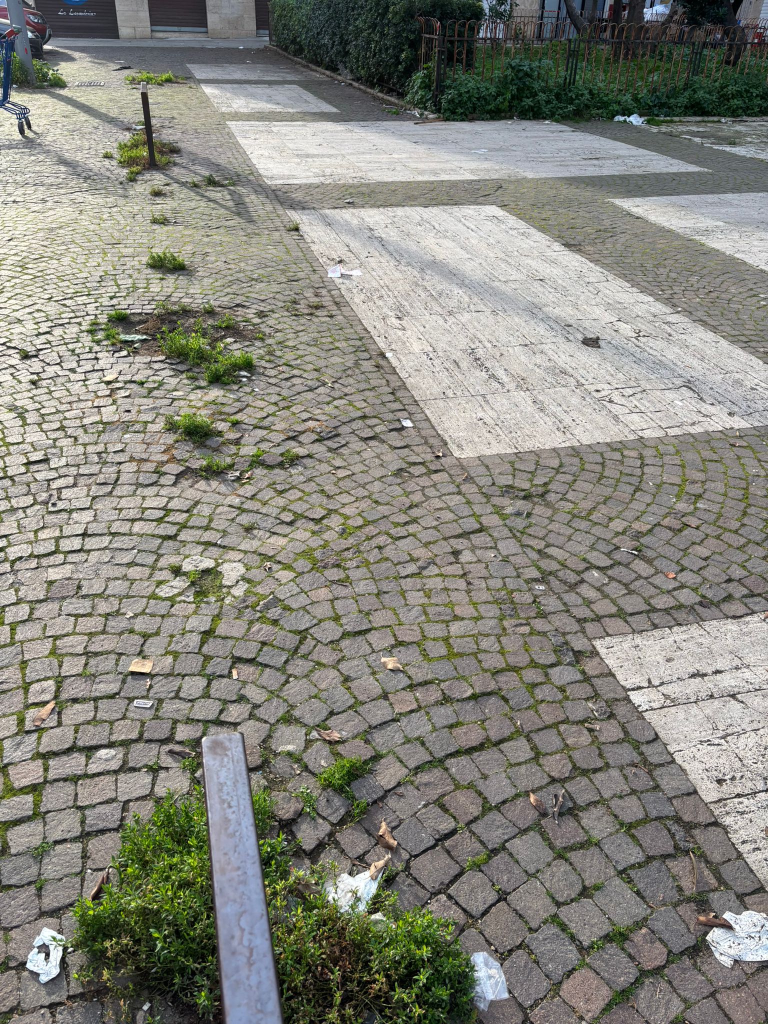 Le fotografie in possesso della redazione documentano sporcizia diffusa, marciapiedi danneggiati e una generale assenza di manutenzione ordinaria degli spazi pubblici.