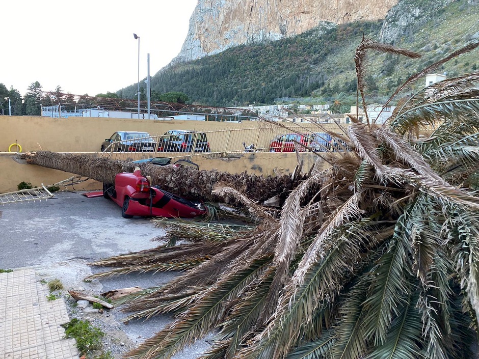 Una palma si è spettata in due e ha distrutto un’auto. Due giovani sono vivi per miracolo. E’ l’ultimo episodio di una lunga serie di danni provocati dal forte vento che si è abbattuto su Palermo e la provincia.