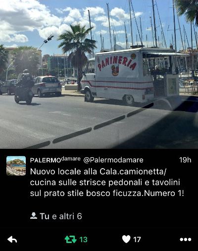 “Nuovo locale alla Cala. Camionetta/cucina sulla strisce pedonali e tavolini sul prato stile bosco Ficuzza. Numero 1!”.