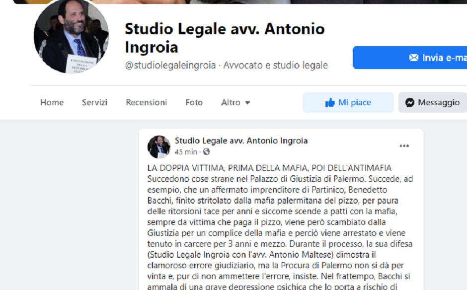 “Tornato a casa, – precisa Ingroia – Bacchi si rinfranca, si prende coraggio e per la prima volta accusa i suoi estorsori, facendo nomi e cognomi dei suoi aguzzini, e fra i nomi ci sono anche nomi ‘pesanti’ della ‘mafia che conta’, diventando a tutti gli effetti un uomo di giustizia, e non certo di mafia. E la Procura che fa? Risponde dicendo che ‘è troppo tardi’, che Bacchi avrebbe dovuto fare quelle dichiarazioni molto prima, e ancora addirittura che avere reso queste dichiarazioni in pubblico dibattimento è un favore ai mafiosi e un danno alle potenziali indagini della Procura! Incredibile ma vero! Non basta: per punirlo rincara la dose chiedendo la condanna a 20 anni di reclusione !!!”.