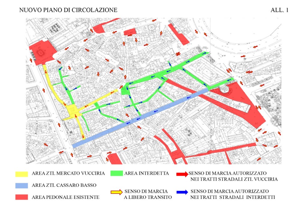 – Istituzione del divieto di transito eccetto i veicoli autorizzati (ZTL Mercato Vucciria), con accesso esclusivo da Piazza S.Andrea;