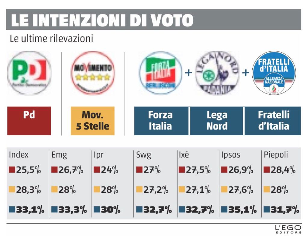 Solo terzo il centrosinistra anche se qui qualche sorpresa potrà arrivare dagli alleati valutati in modo irregolare nei vari sondaggi. La forbice va dal 24 al 28,4%, insomma nella migliore delle ipotesi la coalizione di sinistra dovrebbe battagliare con i 5 stelle per la seconda piazza. Il minimo, in questo caso, è la valutazione di Ipr al 24%, il massimo quella di Piepoli al 28,4%.