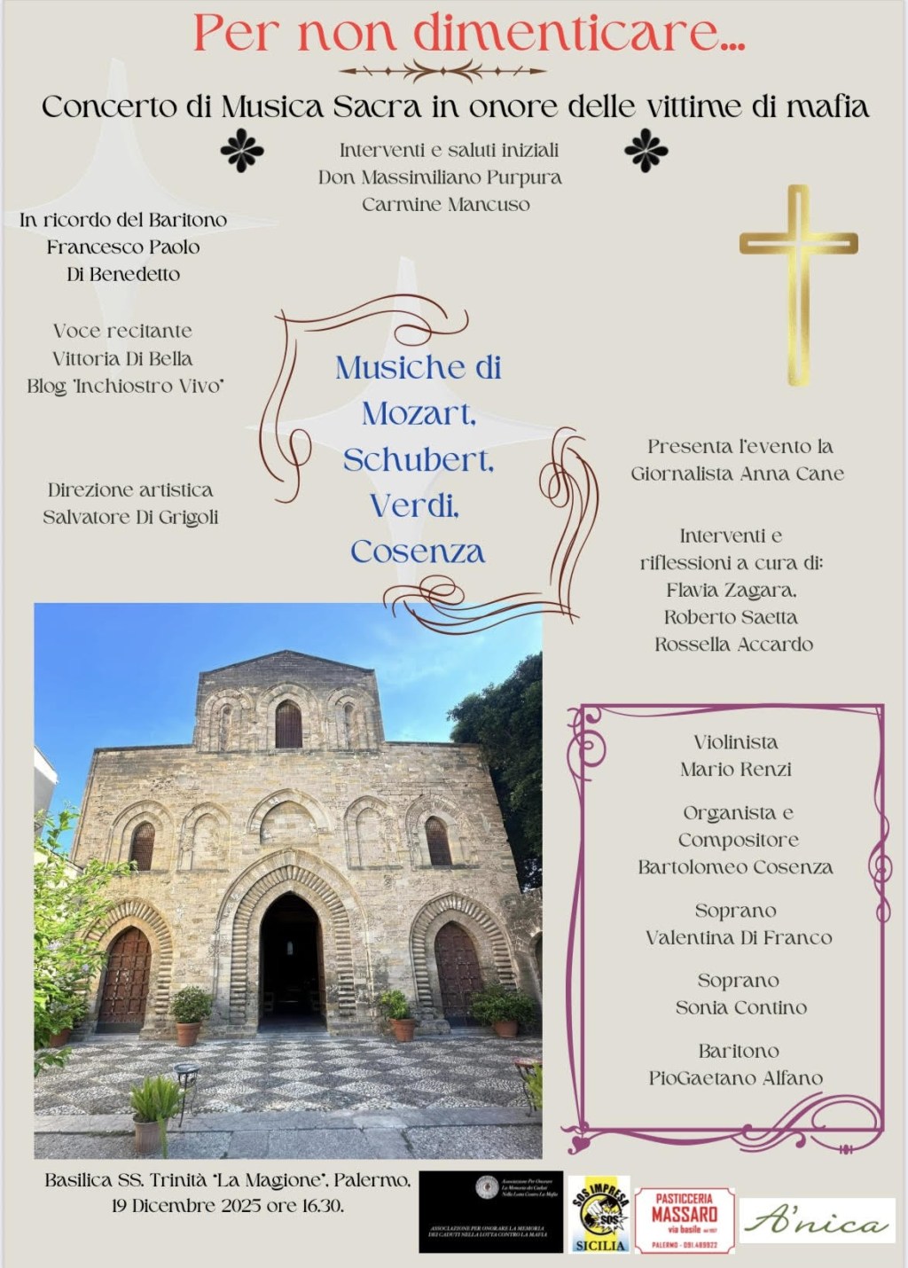 Venerdì 19 dicembre 2025 alle ore 16:30 nella Chiesa della Magione a Palermo si terrà il concerto di musica sacra in onore delle vittime di mafia e del baritono Francesco Paolo Di Benedetto, con la direzione artistica di Salvatore Di Grigoli.