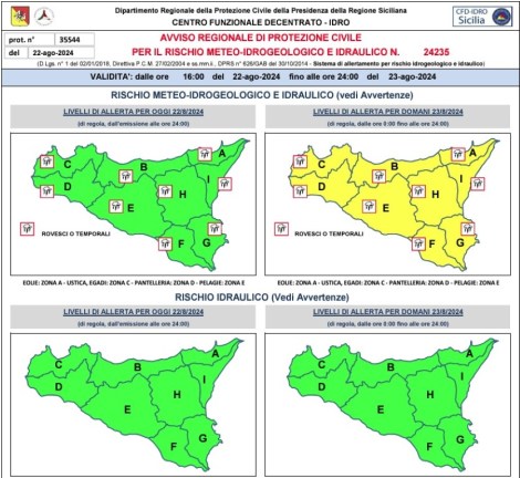 Piogge e temporali previsti in Sicilia ed è allerta gialla in tutta l’isola per venerdì 23 agosto. Lo si legge nell’avviso protezione civile regionale per il rischio meteo-idrogeologico e idraulico 24235.