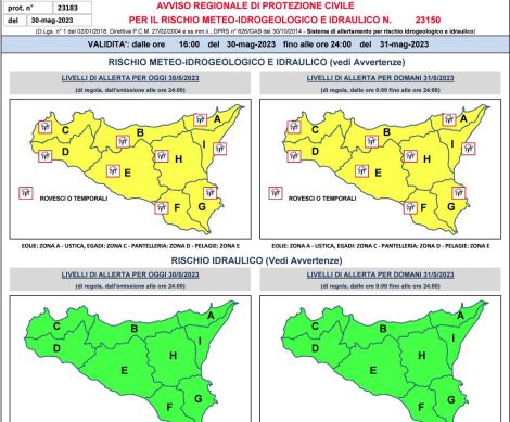 Nuova allerta gialla in tutta la Sicilia. Anche per la giornata di mercoledì 31 maggio sono previsti temporali sparsi nell’isola. Lo si legge nella nota 23150 della protezione civile regionale diramata poco fa.