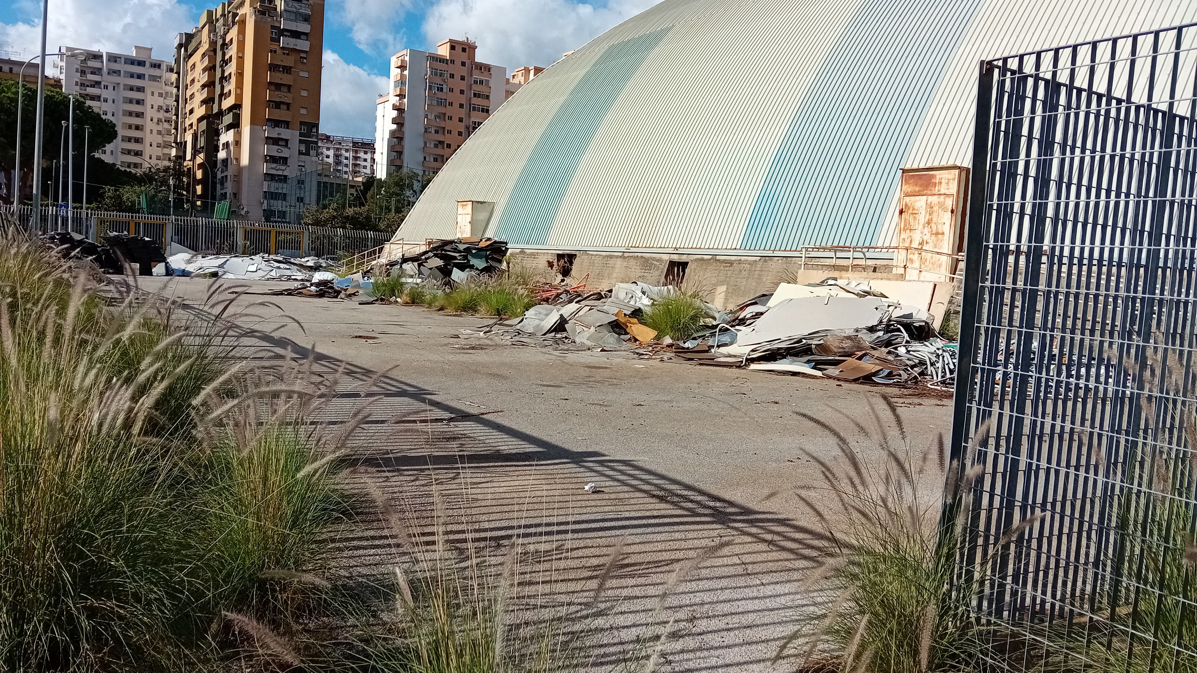 Più che la futura casa del nuoto palermitano, al momento sembra una succursale di una discarica. Questa è la sensazione che un osservatore esterno può avere guardando i numerosi ammassi di rifiuti edili presenti nello spiazzale antistante l’ex Pallone di Italia ’90. Dopo decenni di inattività, la struttura di viale del Fante dovrebbe diventare la sede temporanea di una piscina prefabbricata da utilizzare fino alla fine dei lavori sull’impianto comunale attualmente utilizzato dalle società sportive natatorie. Il condizionale, viste le circostanze, sembra d’obbligo.