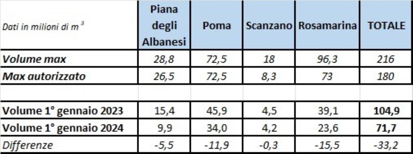 L’Amap riporta anche due tabelle di confronto dalle quali si evincono due dati fondamentali: la netta riduzione negli invasi di Piana degli Albanesi, Poma, Scanzano e Rosamarina nel periodo compreso tra l’1 gennaio 2023 e l’1 gennaio 2024 ed il confronto aggiornato al 15 gennaio, ovvero dopo le piogge di inizio anno.