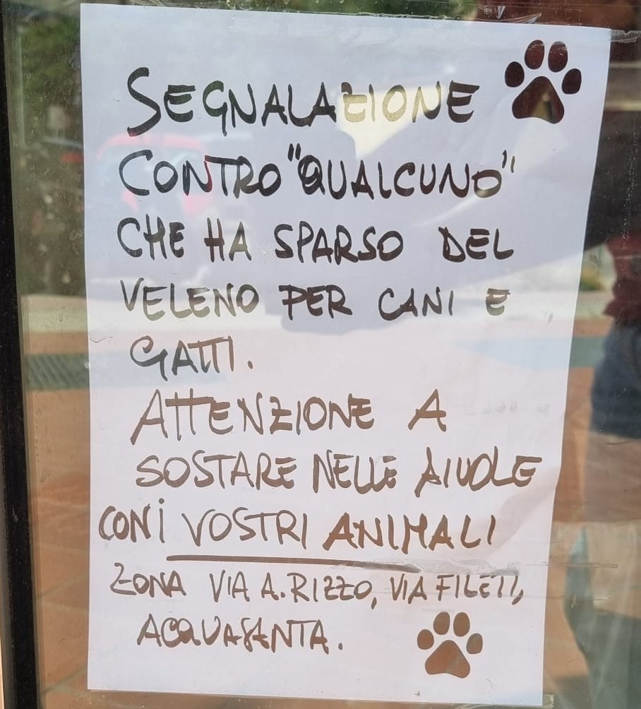 Cani e gatti in pericolo nella zona di via Ammiraglio Rizzo, via Fileti, via Don Orione e nella zona dell’Acquasanta a Palermo. Un ignoto ha sparso in queste vie menzionate delle crocchette avvelenate. Una situazione pericolosa, incresciosa ed ignobile. Nondimeno un gesto vigliacco e senza giustificazione. E difficilmente si riesce a comprendere dove sia il confine della cattiveria o della stupidità.